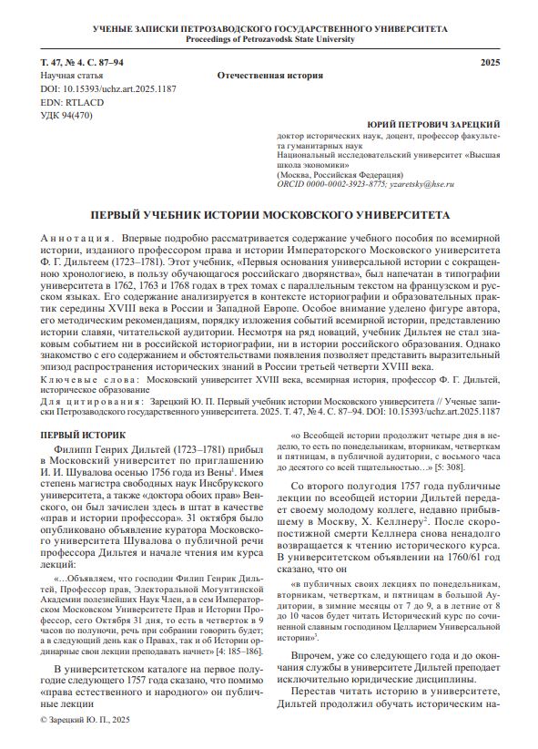Впервые подробно рассматривается содержание учебного пособия по всемирной истории, изданного профессором права и истории Императорского Московского университета Ф. Г. Дильтеем (1723–1781). Этот учебник, «Первыя основания универсальной истории с сокращенною хронологиею, в пользу обучающагося российскаго дворянства», был напечатан в типографии университета в 1762, 1763 и 1768 годах в трех томах с параллельным текстом на французском и русском языках. Его содержание анализируется в контексте историографии и образовательных практик середины XVIII века в России и Западной Европе.