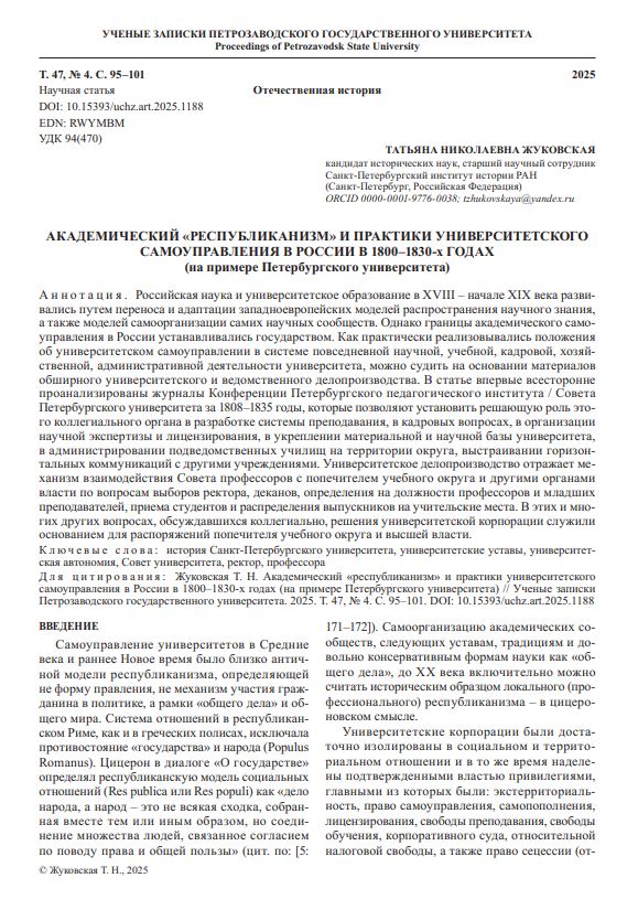 Академический «республиканизм» и практики университетского самоуправления в России в 1800–1830-х годах (на примере Петербургского университета)