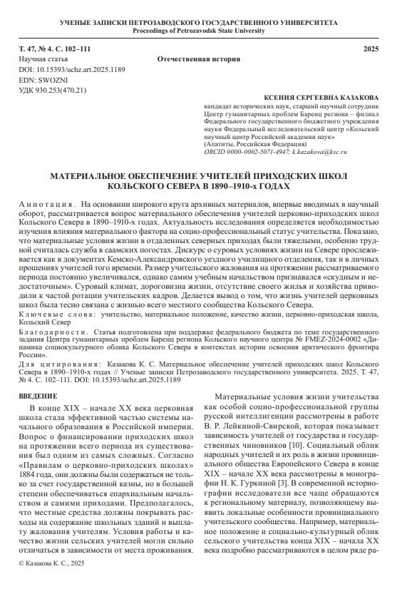 Материальное обеспечение учителей приходских школ Кольского Севера в 1890–1910-х годахКрасникова Юлия Николаевна