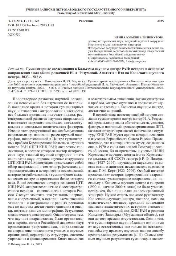 Рец. на кн.: Гуманитарные исследования в Кольском научном центре РАН: история и основные направления / под общей редакцией И. А. Разумовой. Апатиты : Изд-во Кольского научного центра, 2023. 516 с.