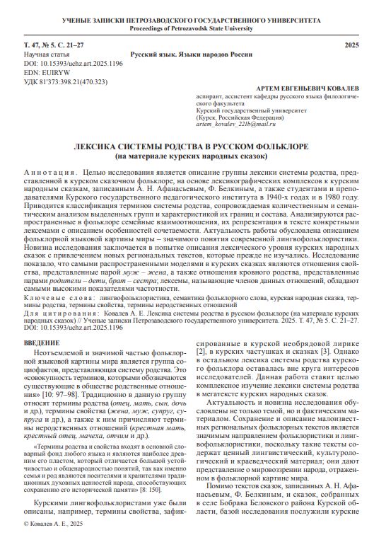 Целью исследования является описание группы лексики системы родства, представленной в курском сказочном фольклоре, на основе лексикографических комплексов к курским народным сказкам, записанным А. Н. Афанасьевым, Ф. Белкиным, а также студентами и преподавателями Курского государственного педагогического института в 1940-х годах и в 1980 году. Приводится классификация терминов системы родства, сопровождаемая количественным и семантическим анализом выделенных групп и характеристикой их границ и состава. Анализируются распространенные в фольклоре семейные взаимоотношения, их репрезентация в тексте конкретными лексемами с описанием особенностей сочетаемости.