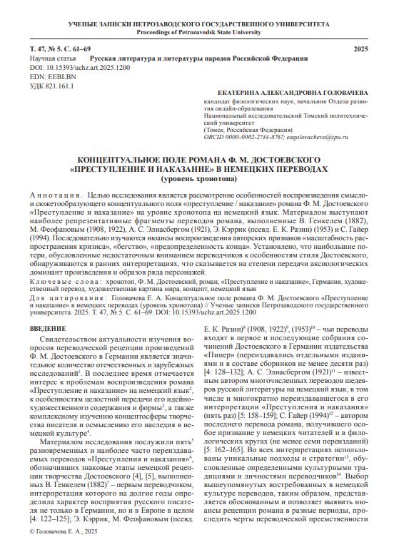 Целью исследования является рассмотрение особенностей воспроизведения смыслои сюжетообразующего концептуального поля «преступление / наказание» романа Ф. М. Достоевского «Преступление и наказание» на уровне хронотопа на немецкий язык. Материалом выступают наиболее репрезентативные фрагменты переводов романа, выполненные В. Генкелем (1882), М. Феофановым (1908, 1922), А. С. Элиасбергом (1921), Э. Кэррик (псевд. Е. К. Разин) (1953) и С. Гайер (1994). Последовательно изучаются нюансы воспроизведения авторских признаков «масштабность распространения кризиса», «бегство», «предопределенность конца». Установлено, что наибольшие потери, обусловленные недостаточным вниманием переводчиков к особенностям стиля Достоевского, обнаруживаются в ранних интерпретациях, что сказывается на степени передачи аксиологических доминант произведения и образов ряда персонажей.