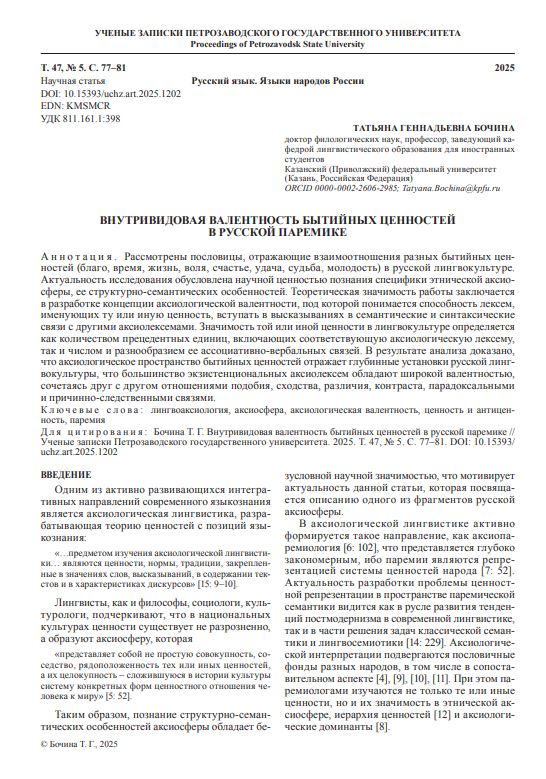 Рассмотрены пословицы, отражающие взаимоотношения разных бытийных ценностей (благо, время, жизнь, воля, счастье, удача, судьба, молодость) в русской лингвокультуре. Актуальность исследования обусловлена научной ценностью познания специфики этнической аксиосферы, ее структурно-семантических особенностей. Теоретическая значимость работы заключается в разработке концепции аксиологической валентности, под которой понимается способность лексем, именующих ту или иную ценность, вступать в высказываниях в семантические и синтаксические связи с другими аксиолексемами.