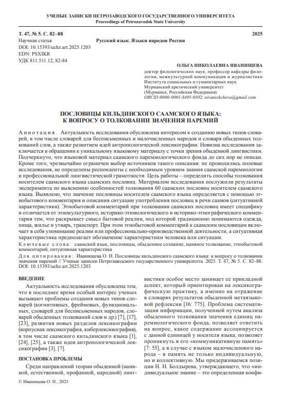 Пословицы кильдинского саамского языка: к вопросу о толковании значения паремийИванов Евгений Евгеньевич
