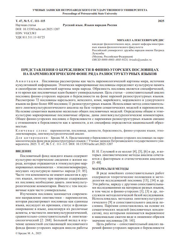 Представления о бережливости в финно-угорских пословицах на паремиологическом фоне ряда разноструктурных языков