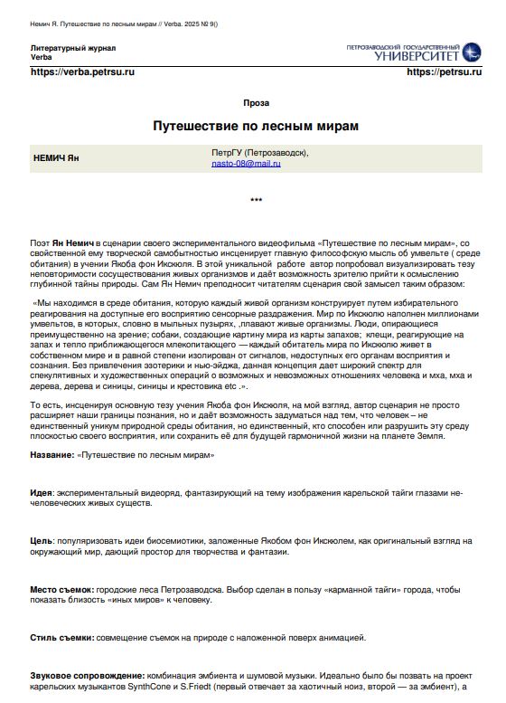 Поэт Ян Немич в сценарии своего экспериментального видеофильма «Путешествие по лесным мирам», со свойственной ему творческой самобытностью инсценирует главную философскую мысль об умвельте ( среде обитания) в учении Якоба фон Икскюля. В этой уникальной работе автор попробовал визуализировать тезу неповторимости сосуществования живых организмов и даёт возможность зрителю прийти к осмыслению глубинной тайны природы.
