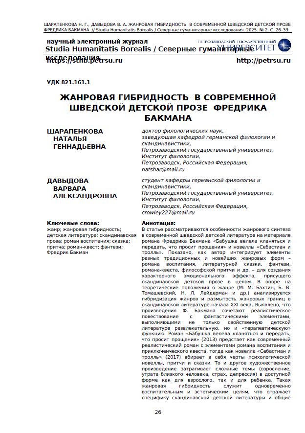 Жанровая гибридность в современной шведской детской прозе Фредрика БакманаВасильева Светлана Владимировна, Макарова Евгения Евгеньевна