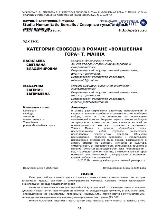 В статье рассматриваются различные представления о сущности понятия «свобода» и связанные с ней проблемы выбора, воли и ответственности на протяжении человеческой истории. Репрезентация категории свободы в литературе позволяет рассмотреть личность во всей ее противоречивости, что ярко отражено в персонажах Томаса Манна в романе «Волшебная гора», представляющем собой глубокое философское исследование человеческой природы. Объектом рассмотрения является детальное и убедительное изображение внутреннего мира героев, размышления о жизни, смерти, об истории, искусстве и культуре, символичность и многозначность описываемых объектов и явлений, сложный философский язык повествования – все, что создает уникальный мир, в котором главный герой проходит путь личностной трансформации в познании граней свободы и ограничений.