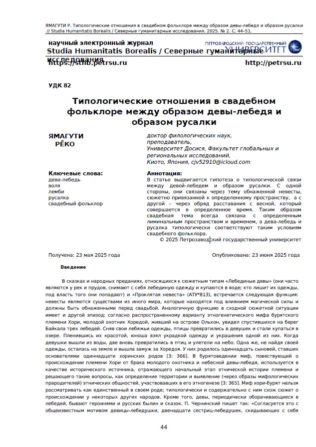 В статье выдвигается гипотеза о типологической связи между девой-лебедем и образом русалки. С одной стороны, они связаны через тему обнаженной невесты, сюжетно привязанной к определенному пространству, а с другой – через обряд расставания с весной, который совершается в определенное время. Таким образом, свадебная тема всегда связана с определенным лиминальным пространством и временем, а дева-лебедь и русалка типологически соответствуют таким условиям свадебного фольклора.