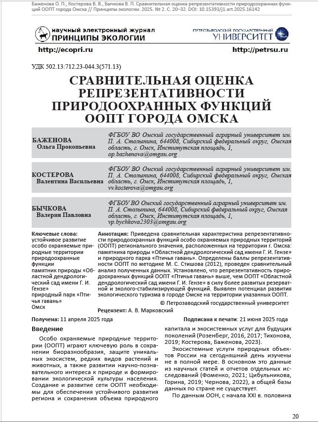 Сравнительная оценка репрезентативности природоохранных функций ООПТ города ОмскаБаканев Сергей Викторович