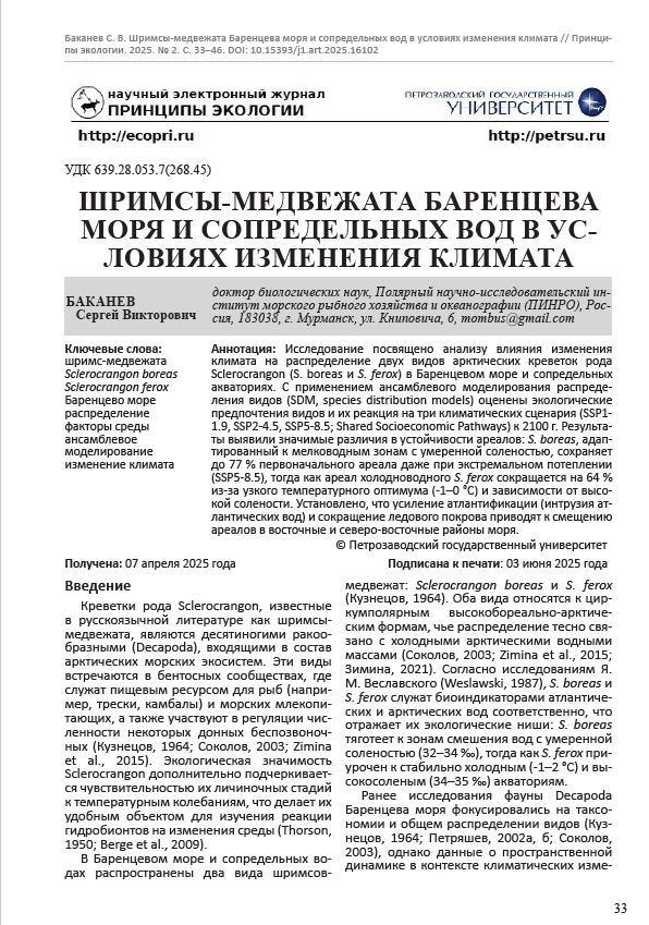 Исследование посвящено анализу влияния изменения климата на распределение двух видов арктических креветок рода Sclerocrangon (S. boreas и S. ferox) в Баренцевом море и сопредельных акваториях. С применением ансамблевого моделирования распределения видов (SDM, species distribution models) оценены экологические предпочтения видов и их реакция на три климатических сценария (SSP1-1.9, SSP2-4.5, SSP5-8.5; Shared Socioeconomic Pathways) к 2100 г. Результаты выявили значимые различия в устойчивости ареалов: S. boreas, адаптированный к мелководным зонам с умеренной соленостью, сохраняет до 77 % первоначального ареала даже при экстремальном потеплении (SSP5-8.5), тогда как ареал холодноводного S. ferox сокращается на 64 % из-за узкого температурного оптимума (-1–0 °C) и зависимости от высокой солености. Установлено, что усиление атлантификации (интрузия атлантических вод) и сокращение ледового покрова приводят к смещению ареалов в восточные и северо-восточные районы моря.