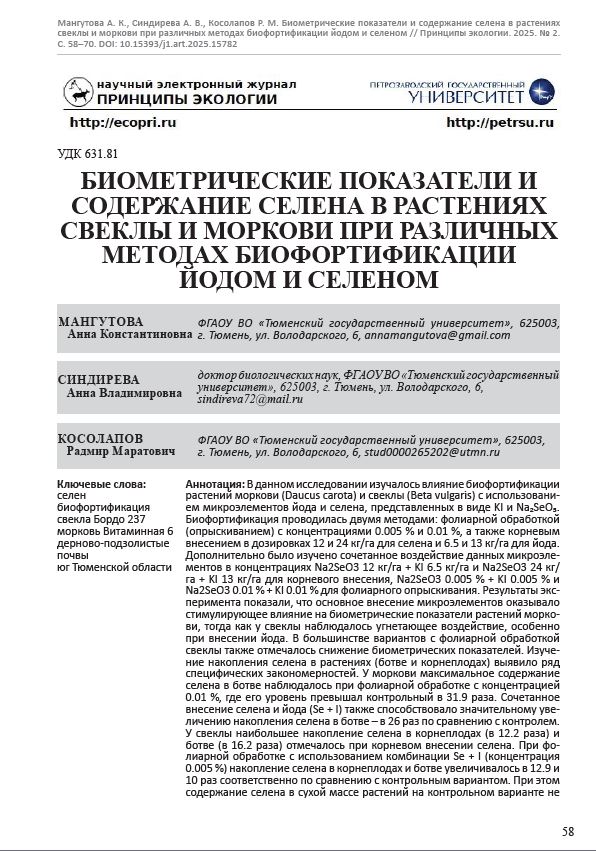 Биометрические показатели и содержание селена в растениях свеклы и моркови при различных методах биофортификации йодом и селеномПлатонова Елена Юрьевна, Голубев Денис Анатольевич, Земская Надежда Владимировна, Михайлова Дарья Владимировна, Пакшина Наталья Ришатовна, Тимушева Наталия Сергеевна, Шапошников Михаил Вячеславович, Москалев Алексей Александрович