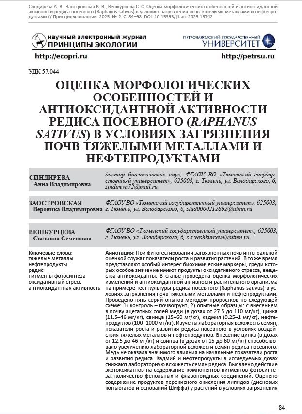 При фитотестировании загрязненных почв интегральной оценкой служат показатели роста и развития растений. В статье проведена оценка морфологических изменений и антиоксидантной активности растительного организма на примере тест-культуры редиса посевного (Raphanus sativus) в условиях загрязнения почв тяжелыми металлами и нефтепродуктами. Проведено пять серий опытов методом проростков по следующей схеме: 1) контроль – почвогрунт; 2) опытные образцы: с внесением в почву ацетатных солей меди (в дозах от 27.5 до 110 мг/кг), цинка (11.5–46 мг/кг), свинца (15–60 мг/кг), кадмия (0.25–1 мг/кг), нефтепродуктов (100–1000 мг/кг). Изучены лабораторная всхожесть семян, показатели роста и развития редиса посевного в условиях воздействия тяжелых металлов и нефтепродуктов.
