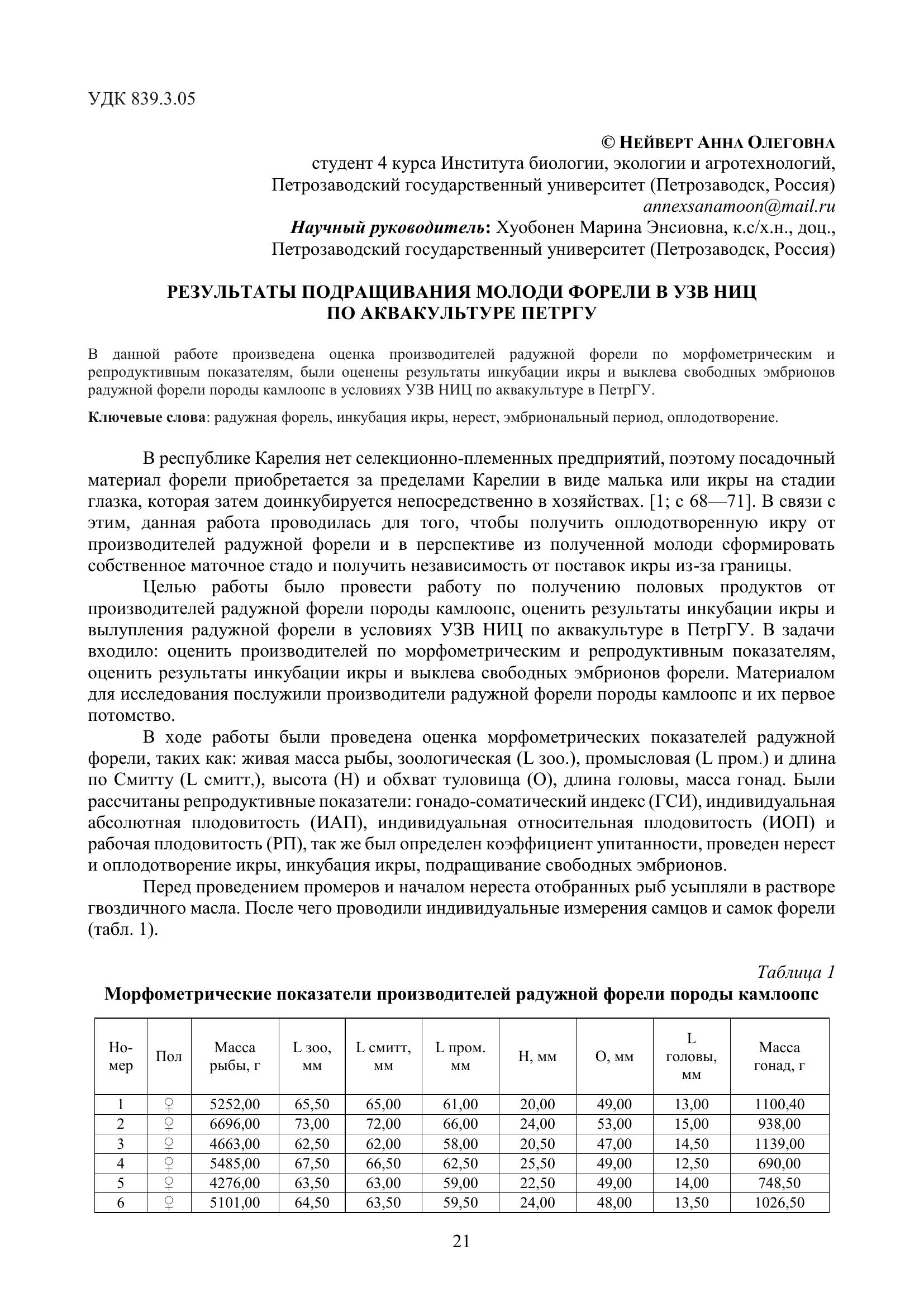 В данной работе произведена оценка производителей радужной форели по морфометрическим и репродуктивным показателям, были оценены результаты инкубации икры и выклева свободных эмбрионов радужной форели породы камлоопс в условиях УЗВ НИЦ по аквакультуре в ПетрГУ.