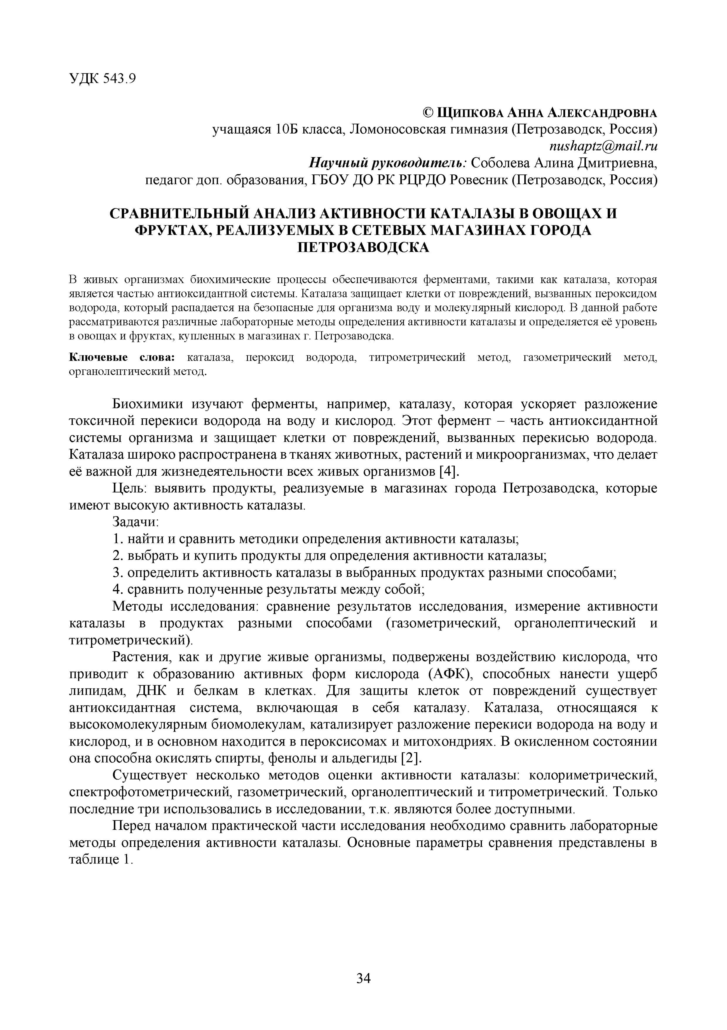 Сравнительный анализ активности каталазы в овощах и фруктах, реализуемых в сетевых магазинах города Петрозаводска
