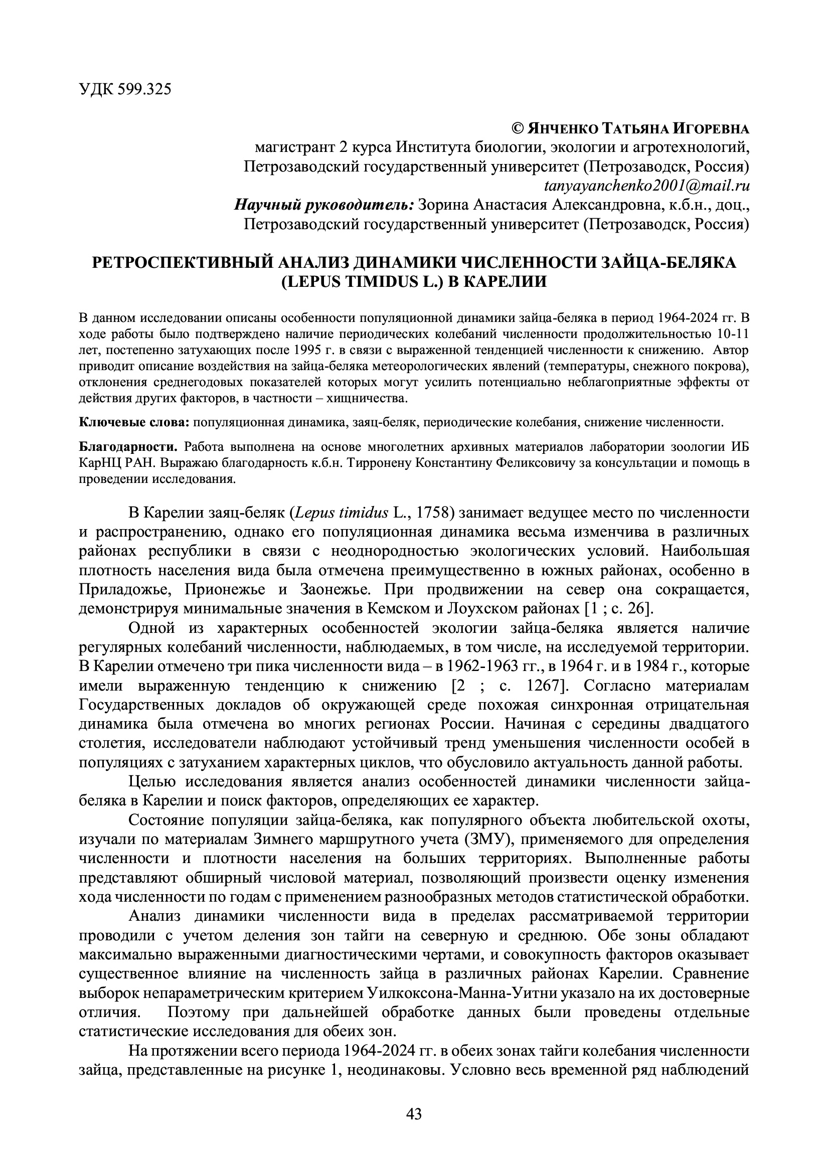 Ретроспективный анализ динамики численности зайца-беляка (Lepus timidus L.) в Карелии