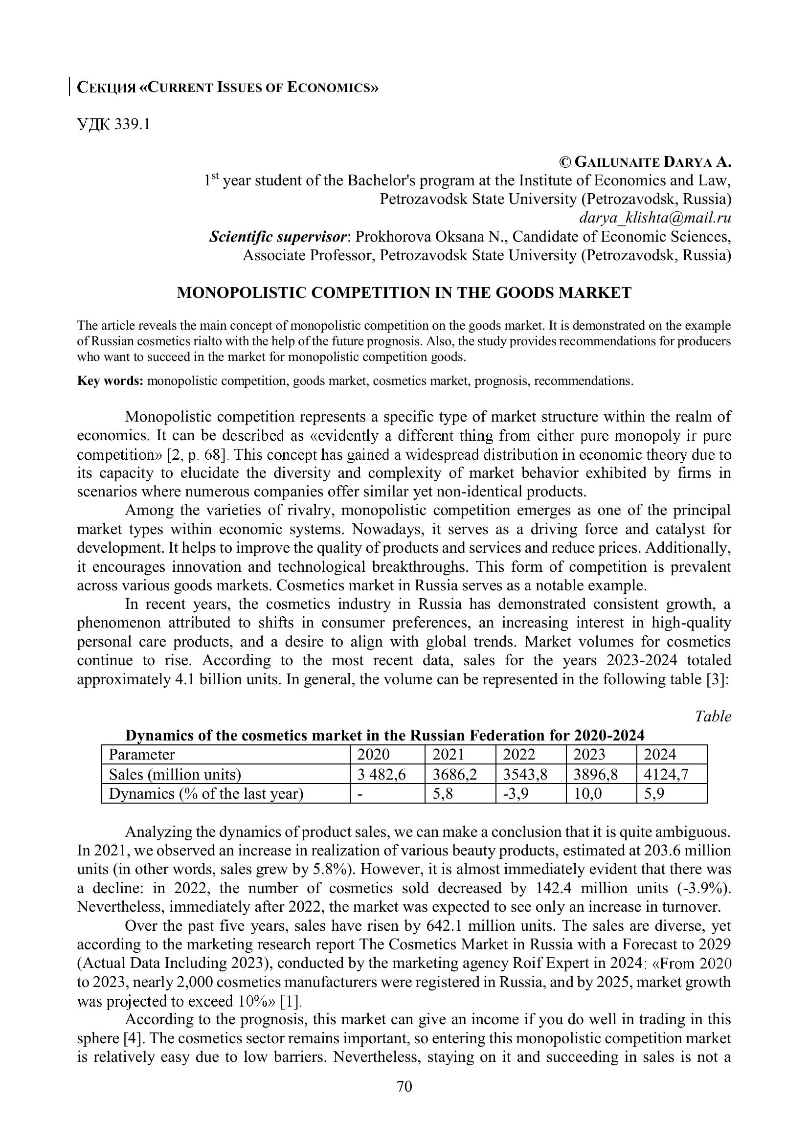 Gailunaite D. A. Monopolistic competition in the goods market / D. A. Gailunaite. — Текст : электронный // Научно-исследовательская работа обучающихся и молодых учёных: материалы 77-й Всероссийской (с международным участием) научной конференции обучающихся и молодых учёных, посвящённой 85-летию ПетрГУ и 80-летию Победы в Великой Отечественной войне (г. Петрозаводск, 31 марта – 27 апреля 2025 года). — Петрозаводск : Изд-во ПетрГУ, 2025. — С. 70-72. — URL: http://elibrary.petrsu.ru/books/79584 (дата обращения: 05.12.2025)