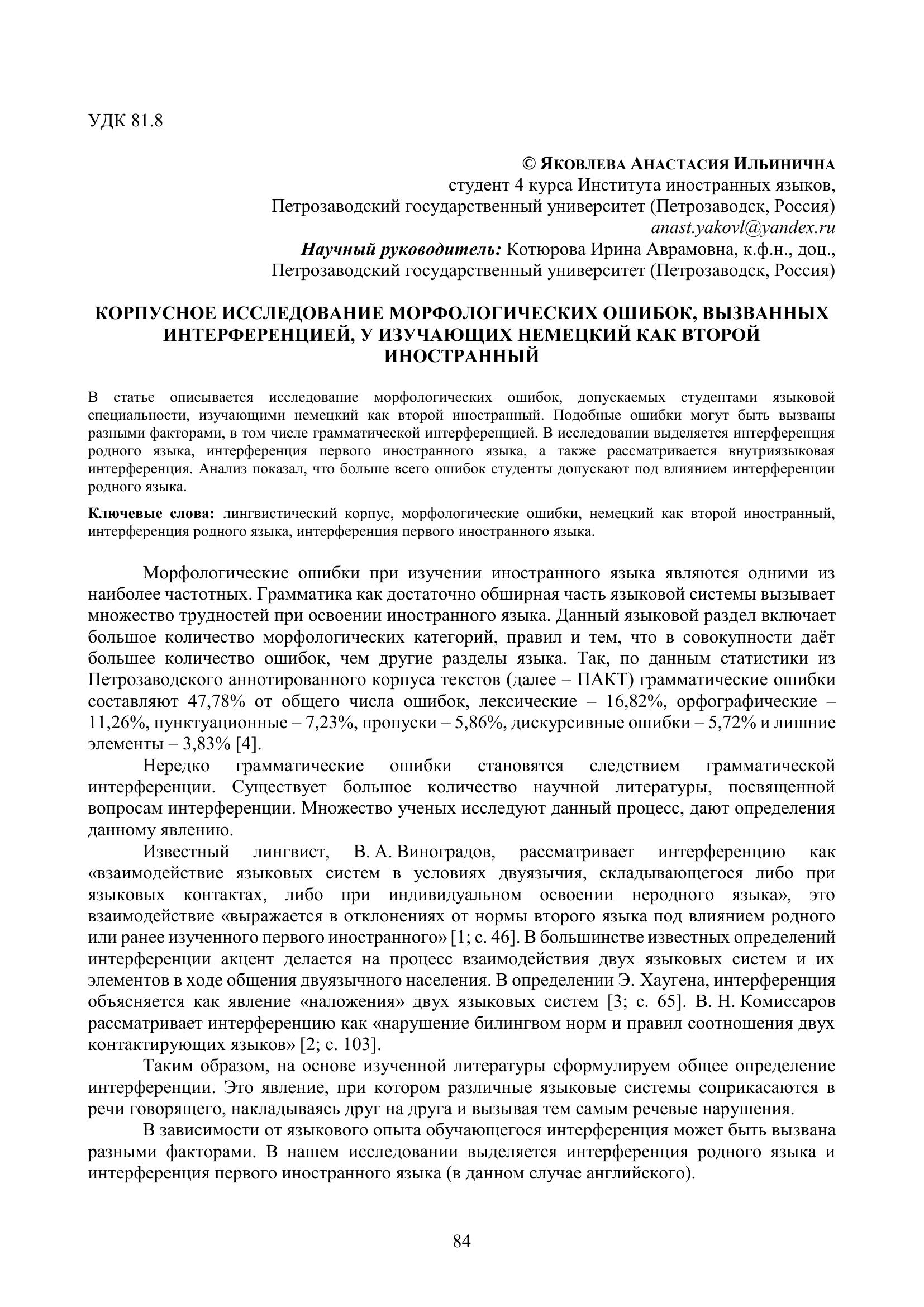 В статье описывается исследование морфологических ошибок, допускаемых студентами языковой специальности, изучающими немецкий как второй иностранный. Подобные ошибки могут быть вызваны разными факторами, в том числе грамматической интерференцией. В исследовании выделяется интерференция родного языка, интерференция первого иностранного языка, а также рассматривается внутриязыковая интерференция. Анализ показал, что больше всего ошибок студенты допускают под влиянием интерференции родного языка.