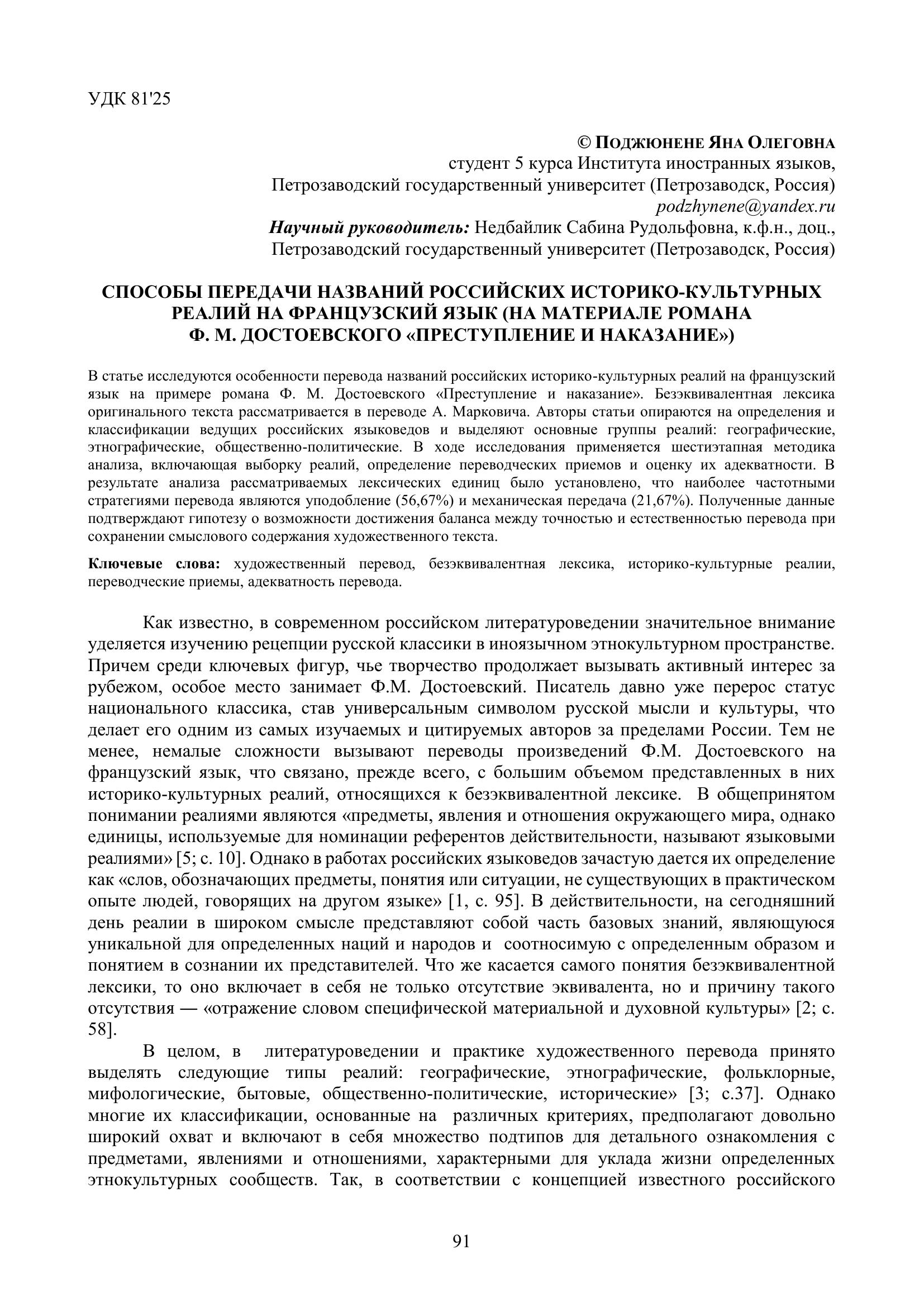 Способы передачи названий российских историко-культурных реалий на французский язык (на материале романа Ф. М. Достоевского «Преступление и наказание»)