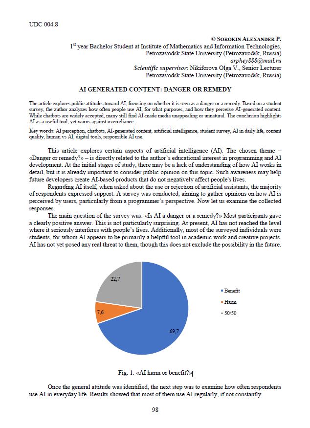 Sorokin A. P. AI generated content: danger or remedy / A. P. Sorokin. — Текст : электронный // Научно-исследовательская работа обучающихся и молодых учёных: материалы 77-й Всероссийской (с международным участием) научной конференции обучающихся и молодых учёных, посвящённой 85-летию ПетрГУ и 80-летию Победы в Великой Отечественной войне (г. Петрозаводск, 31 марта – 27 апреля 2025 года). — Петрозаводск : Изд-во ПетрГУ, 2025. — С. 98-101. — URL: http://elibrary.petrsu.ru/books/79625 (дата обращения: 05.12.2025)