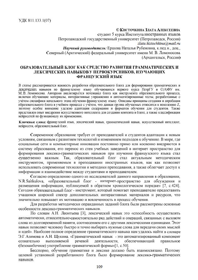 Кисточкина З. А. Образовательный блог как средство развития грамматических и лексических навыков у первокурсников, изучающих французский язык / З. А. Кисточкина. — Текст : электронный // Научно-исследовательская работа обучающихся и молодых учёных: материалы 77-й Всероссийской (с международным участием) научной конференции обучающихся и молодых учёных, посвящённой 85-летию ПетрГУ и 80-летию Победы в Великой Отечественной войне (г. Петрозаводск, 31 марта – 27 апреля 2025 года). — Петрозаводск : Изд-во ПетрГУ, 2025. — С. 109-113. — URL: http://elibrary.petrsu.ru/books/79724 (дата обращения: 05.12.2025)