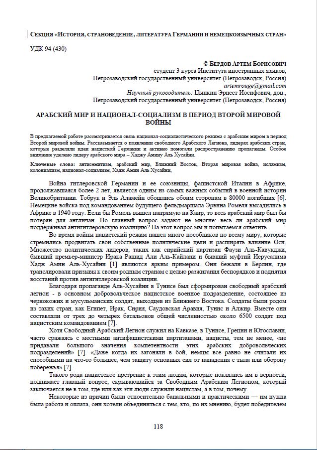 Бердов А. Б. Арабский мир и национал-социализм в период Второй мировой войны / А. Б. Бердов . — Текст : электронный // Научно-исследовательская работа обучающихся и молодых учёных: материалы 77-й Всероссийской (с международным участием) научной конференции обучающихся и молодых учёных, посвящённой 85-летию ПетрГУ и 80-летию Победы в Великой Отечественной войне (г. Петрозаводск, 31 марта – 27 апреля 2025 года). — Петрозаводск : Изд-во ПетрГУ, 2025. — С. 118-120. — URL: http://elibrary.petrsu.ru/books/79745 (дата обращения: 05.12.2025)