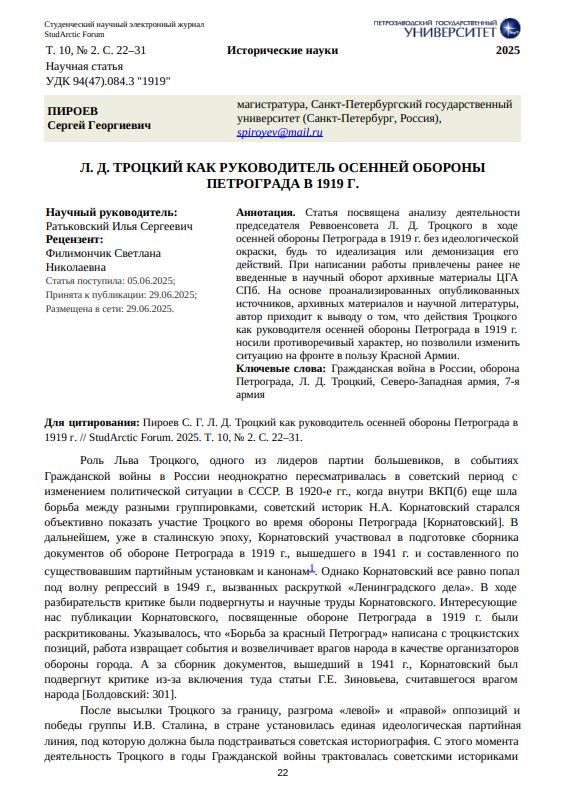 Л. Д. Троцкий как руководитель осенней обороны Петрограда в 1919 г.Попов Денис Александрович