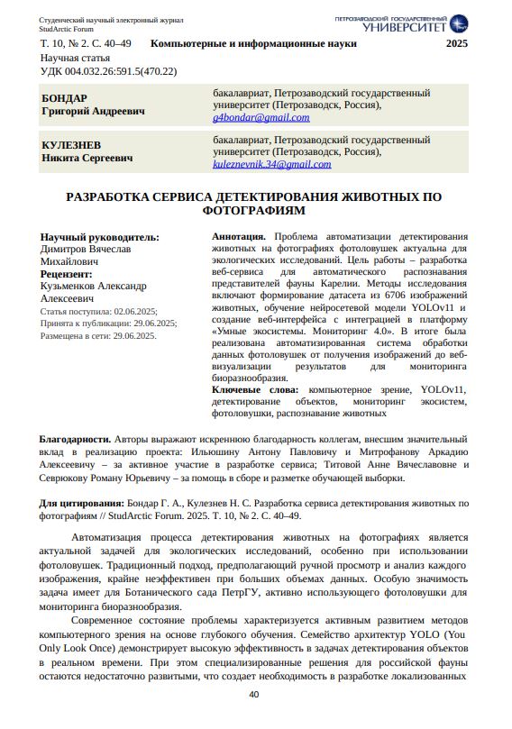 Проблема автоматизации детектирования животных на фотографиях фотоловушек актуальна для экологических исследований. Цель работы – разработка веб-сервиса для автоматического распознавания представителей фауны Карелии. Методы исследования включают формирование датасета из 6706 изображений животных, обучение нейросетевой модели YOLOv11 и создание веб-интерфейса с интеграцией в платформу «Умные экосистемы. Мониторинг 4.0». В итоге была реализована автоматизированная система обработки данных фотоловушек от получения изображений до веб-визуализации результатов для мониторинга биоразнообразия.