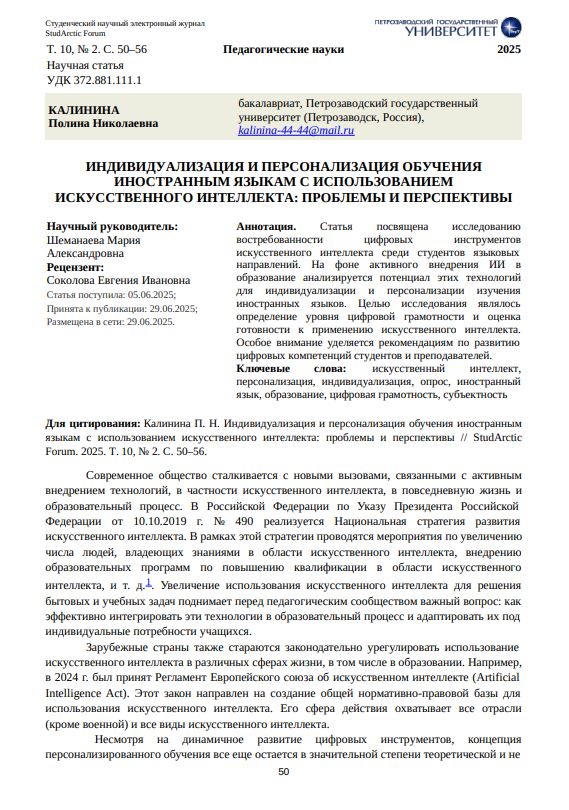 Статья посвящена исследованию востребованности цифровых инструментов искусственного интеллекта среди студентов языковых направлений. На фоне активного внедрения ИИ в образование анализируется потенциал этих технологий для индивидуализации и персонализации изучения иностранных языков. Целью исследования являлось определение уровня цифровой грамотности и оценка готовности к применению искусственного интеллекта. Особое внимание уделяется рекомендациям по развитию цифровых компетенций студентов и преподавателей.