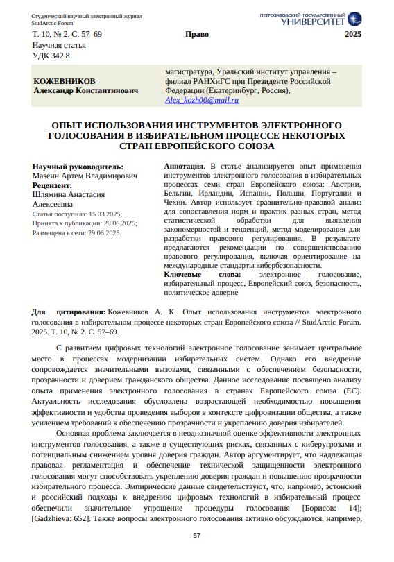 В статье анализируется опыт применения инструментов электронного голосования в избирательных процессах семи стран Европейского союза: Австрии, Бельгии, Ирландии, Испании, Польши, Португалии и Чехии. Автор использует сравнительно-правовой анализ для сопоставления норм и практик разных стран, метод статистической обработки для выявления закономерностей и тенденций, метод моделирования для разработки правового регулирования. В результате предлагаются рекомендации по совершенствованию правового регулирования, включая ориентирование на международные стандарты кибербезопасности.