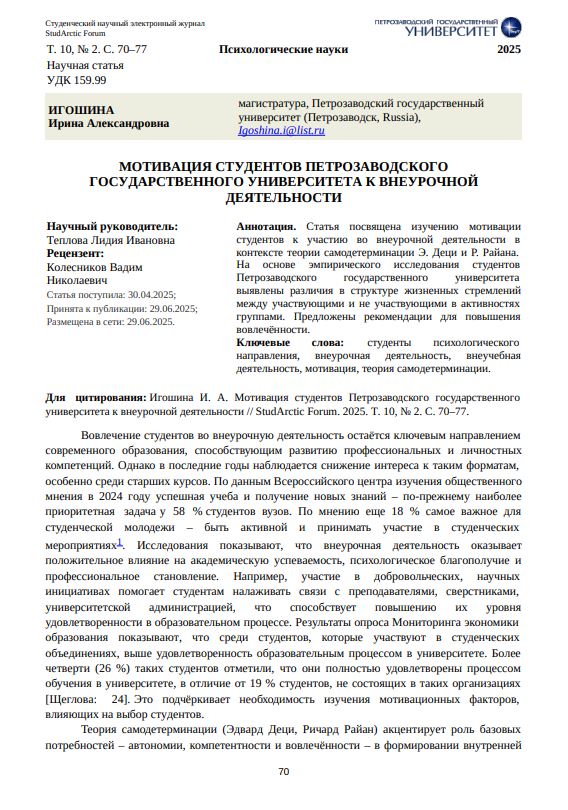 Мотивация студентов Петрозаводского государственного университета к внеурочной деятельности