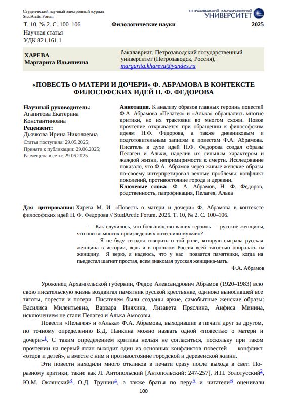 К анализу образов главных героинь повестей Ф. А. Абрамова «Пелагея» и «Алька» обращались многие критики, но их трактовки во многом схожи. Новое прочтение открывается при обращении к философским идеям Н. Ф. Федорова, а также дневниковым и подготовительным записям к повестям Ф. А. Абрамова. Писатель в духе идей Н. Ф. Федорова создал образы Пелагеи и Альки, наделив их сильным характером и жаждой жизни, непримиримости к смерти. Исследование показало, что Ф. А. Абрамов через живые женские образы по-своему интерпретировал вечные проблемы: конфликт поколений, противостояние города и деревни.