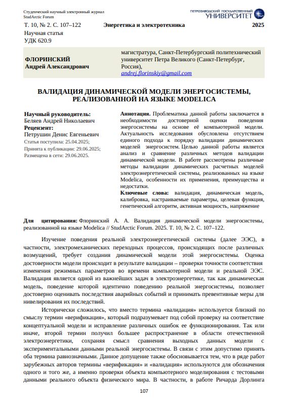 Проблематика данной работы заключается в необходимости достоверной оценки поведения энергосистемы на основе её компьютерной модели. Актуальность исследования обусловлена отсутствием единого подхода к порядку валидации динамических моделей энергосистем. Целью данной работы является анализ и сравнение различных методов валидации динамической модели. В работе рассмотрены различные методы валидации динамических расчетных моделей электроэнергетической системы, реализованных на языке Modelica, особенности их применения, преимущества и недостатки.