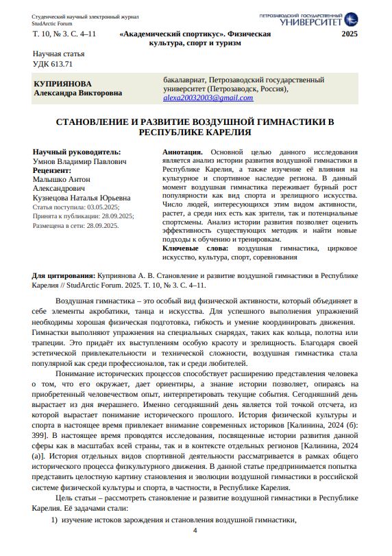 Становление и развитие воздушной гимнастики в Республике КарелияРазумовская Дарья Дмитриевна