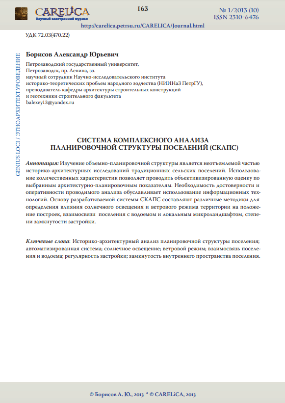 Изучение объемно-планировочной структуры является неотъемлемой частью историко-архитектурных исследований традиционных сельских поселений. Использование количественных характеристик позволяет проводить объективизированную оценку по выбранным архитектурно-планировочным показателям. Необходимость достоверности и оперативности проводимого анализа обуславливает использование информационных технологий. Основу разрабатываемой системы СКАПС составляют различные методики для определения влияния солнечного освещения и ветрового режима территории на положение построек, взаимосвязи поселения с водоемом и локальным микроландшафтом, степени замкнутости застройки.