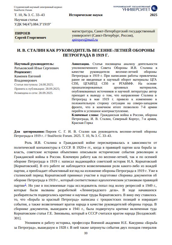 Статья посвящена анализу деятельности уполномоченного Совета Обороны И.В. Сталина в качестве руководителя весенне-летней обороны Петрограда в 1919 г. При написании работы привлечены ранее не введенные в научный оборот материалы ЦГА СПб, ЦГАИПД СПб и РГАВМФ. На основе проанализированных архивных материалов, опубликованных источников и научной литературы автор приходит к выводу о том, что направление Сталина в Петроград в мае 1919 г. привело к изменению в положительную сторону ситуации на северо-западном фронте, что в конечном итоге позволило 7-й армии перейти в успешное контрнаступление.