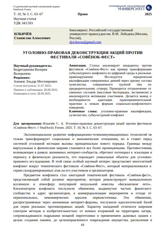 Статья анализирует инциденты против фестиваля «Совёнок-Фест» как пример трансформации субкультурного конфликта из цифровой среды в реальные правонарушения. Исследуется юридическая квалификация совершенных деяний через призму состава хулиганства, совершенного группой лиц по предварительному сговору. Проводится отграничение от смежных составов (массовые беспорядки, экстремизм) и анализируется мотивация участников. Делается вывод о необходимости адаптации правоприменительной практики к новым формам социально-конфликтного поведения.