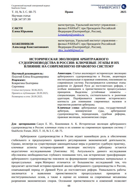 Статья анализирует историческую эволюцию арбитражного судопроизводства в России, акцентируя институциональные и правовые изменения, повлиявшие на современную систему. Рассматриваются ключевые этапы развития от Древней Руси до постсоветских реформ, с особым вниманием к преемственности процессуальных принципов. Выделены устойчивые элементы – специализация, гласность, состязательность и рыночная адаптация. Подчёркивается значение исторического контекста для понимания современных вызовов и перспектив развития арбитража.