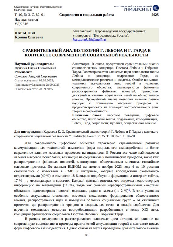 В статье представлен сравнительный анализ социологических концепций Гюстава Лебона и Габриэля Тарда. Рассматриваются ключевые идеи психологии толпы Лебона и концепции подражания Тарда, их методологические различия и сходства. Особое внимание уделяется актуальности этих теорий в условиях современного общества: анализируются феномены распространения фейковых новостей, протестных движений и влияния социальных сетей на общественное мнение. Проведённый анализ позволил выявить разные подходы к пониманию массовых процессов и продемонстрировать на примерах востребованность этих теорий в современности.