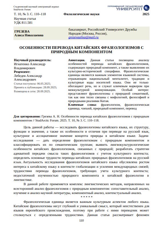 Данная статья посвящена анализу особенностей перевода китайских фразеологизмов, содержащих природный компонент, а также выявлению их культурно-исторической специфики. Фразеологические единицы являются важным элементом языковой системы, отражающим национальный менталитет, традиции и культурные коды носителей языка. Они не только обогащают речь, но и служат ключевым маркером при межкультурной коммуникации. Особый интерес представляют фразеологизмы с природной семантикой, так как они тесно связаны с мифологией, философией и природными реалиями Китая.