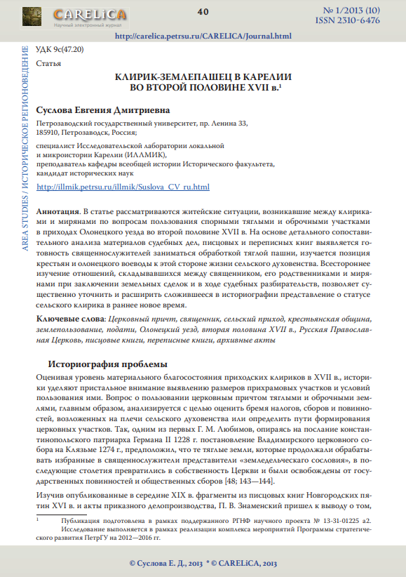 В статье рассматриваются житейские ситуации, возникавшие между клириками и мирянами по вопросам пользования спорными тяглыми и оброчными участками в приходах Олонецкого уезда во второй половине XVII в. На основе детального сопоставительного анализа материалов судебных дел, писцовых и переписных книг выявляется готовность священнослужителей заниматься обработкой тяглой пашни, изучается позиция крестьян и олонецкого воеводы к этой стороне жизни сельского духовенства. Всестороннее изучение отношений, складывавшихся между священником, его родственниками и мирянами при заключении земельных сделок и в ходе судебных разбирательств, позволяет существенно уточнить и расширить сложившееся в историографии представление о статусе сельского клирика в раннее новое время.