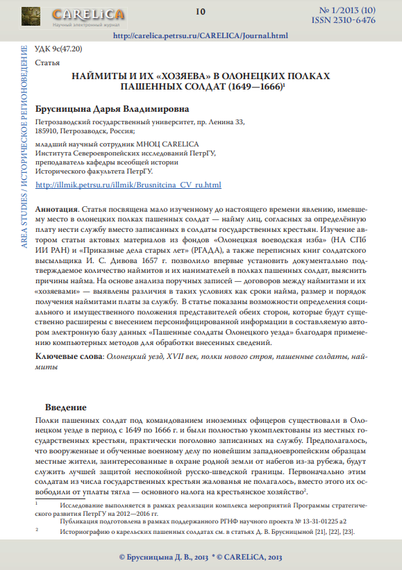 Наймиты и их «хозяева» в олонецких полках пашенных солдат (1649–1666)Чернякова Ирина Александровна