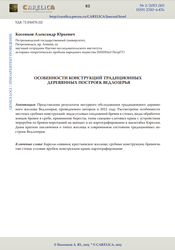 Особенности конструкций традиционных деревянных построек ВедлозерьяКосенков Александр Юрьевич, Марков Борис Георгиевич, Марков Олег Борисович