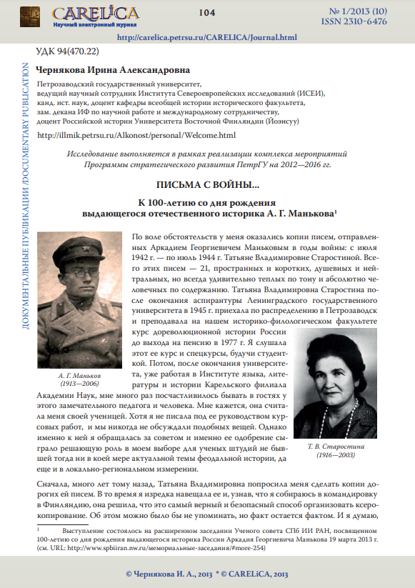 Письма с войны... К 100-летию со дня рождения выдающегося отечественного историка А. Г. Манькова