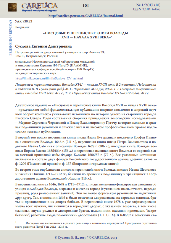 Рецензия на книгу «Писцовые и переписные книги Вологды XVII – начала XVIII века»