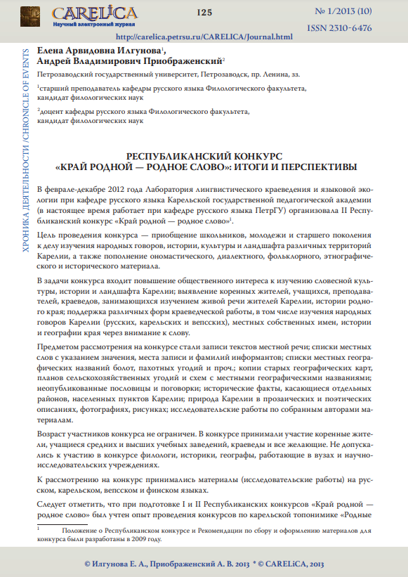 В феврале-декабре 2012 года Лаборатория лингвистического краеведения и языковой экологии при кафедре русского языка Карельской государственной педагогической академии (в настоящее время работает при кафедре русского языка ПетрГУ) организовала II Республиканский конкурс «Край родной – родное слово».
