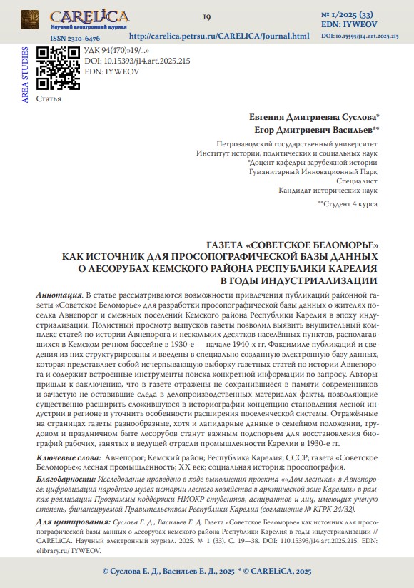 Газета «Советское Беломорье» как источник для просопографической базы данных о лесорубах Кемского района Республики Карелия в годы индустриализации