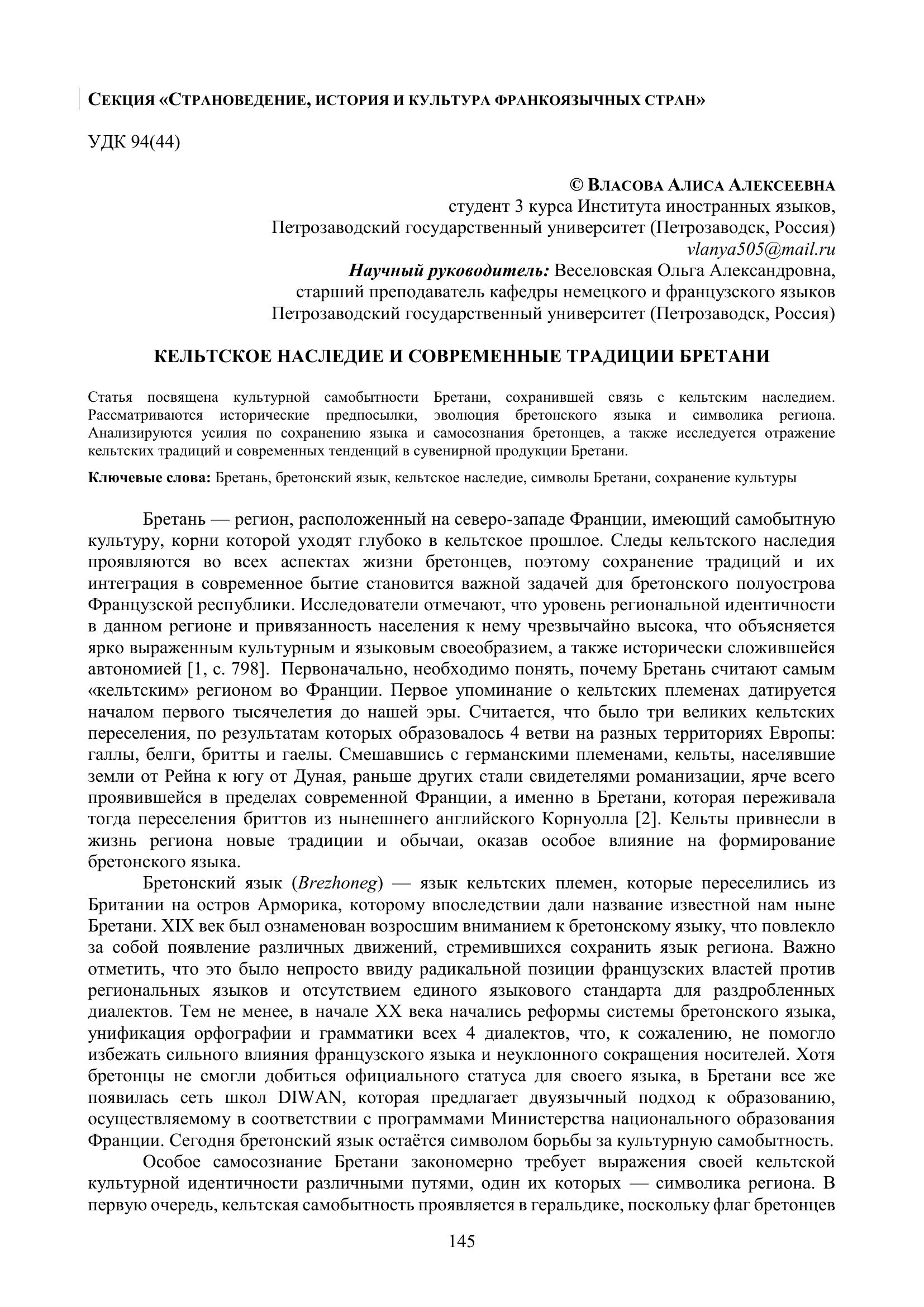 Власова А. А. Кельтское наследие и современные традиции Бретани / А. А. Власова. — Текст : электронный // Научно-исследовательская работа обучающихся и молодых учёных: материалы 77-й Всероссийской (с международным участием) научной конференции обучающихся и молодых учёных, посвящённой 85-летию ПетрГУ и 80-летию Победы в Великой Отечественной войне (г. Петрозаводск, 31 марта – 27 апреля 2025 года). — Петрозаводск : Изд-во ПетрГУ, 2025. — С. 145-147. — URL: http://elibrary.petrsu.ru/books/79871 (дата обращения: 05.12.2025)