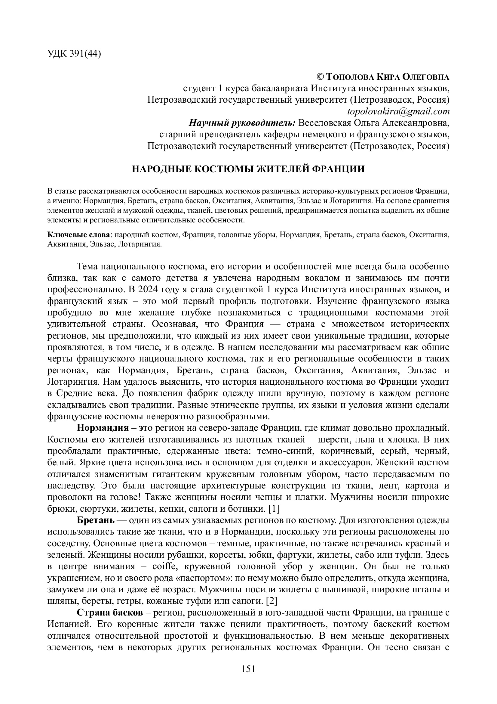 Тополова К. О. Народные костюмы жителей Франции / К. О. Тополова. — Текст : электронный // Научно-исследовательская работа обучающихся и молодых учёных: материалы 77-й Всероссийской (с международным участием) научной конференции обучающихся и молодых учёных, посвящённой 85-летию ПетрГУ и 80-летию Победы в Великой Отечественной войне (г. Петрозаводск, 31 марта – 27 апреля 2025 года). — Петрозаводск : Изд-во ПетрГУ, 2025. — С. 151-154. — URL: http://elibrary.petrsu.ru/books/79873 (дата обращения: 05.12.2025)