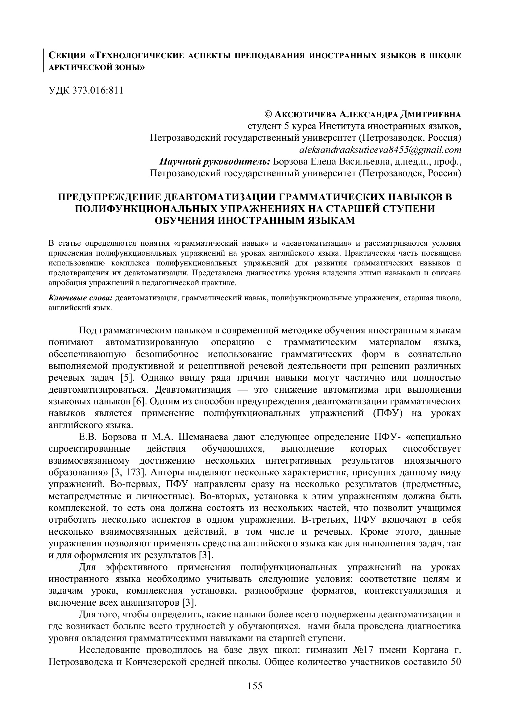Аксютичева А. Д. Предупреждение деавтоматизации грамматических навыков в полифункциональных упражнениях на старшей ступени обучения иностранным языкам / А. Д. Аксютичева. — Текст : электронный // Научно-исследовательская работа обучающихся и молодых учёных: материалы 77-й Всероссийской (с международным участием) научной конференции обучающихся и молодых учёных, посвящённой 85-летию ПетрГУ и 80-летию Победы в Великой Отечественной войне (г. Петрозаводск, 31 марта – 27 апреля 2025 года). — Петрозаводск : Изд-во ПетрГУ, 2025. — С. 155-158. — URL: http://elibrary.petrsu.ru/books/79874 (дата обращения: 05.12.2025)
